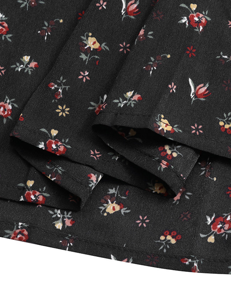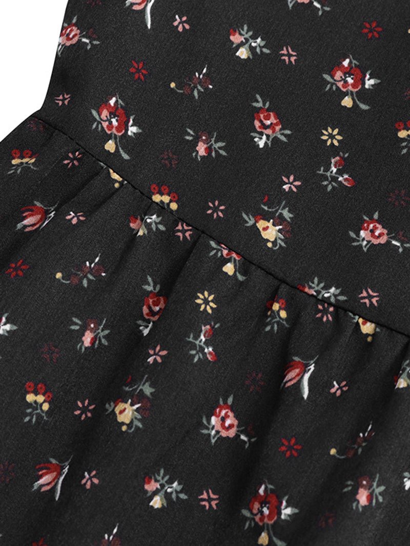 A floral print maxi dress featuring long sleeves, smocked waist, and a flowy silhouette.