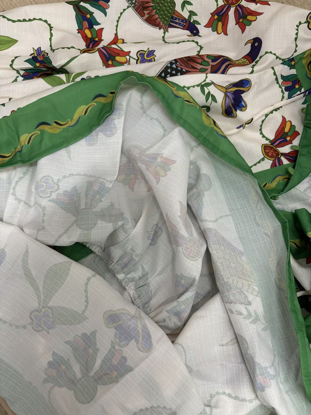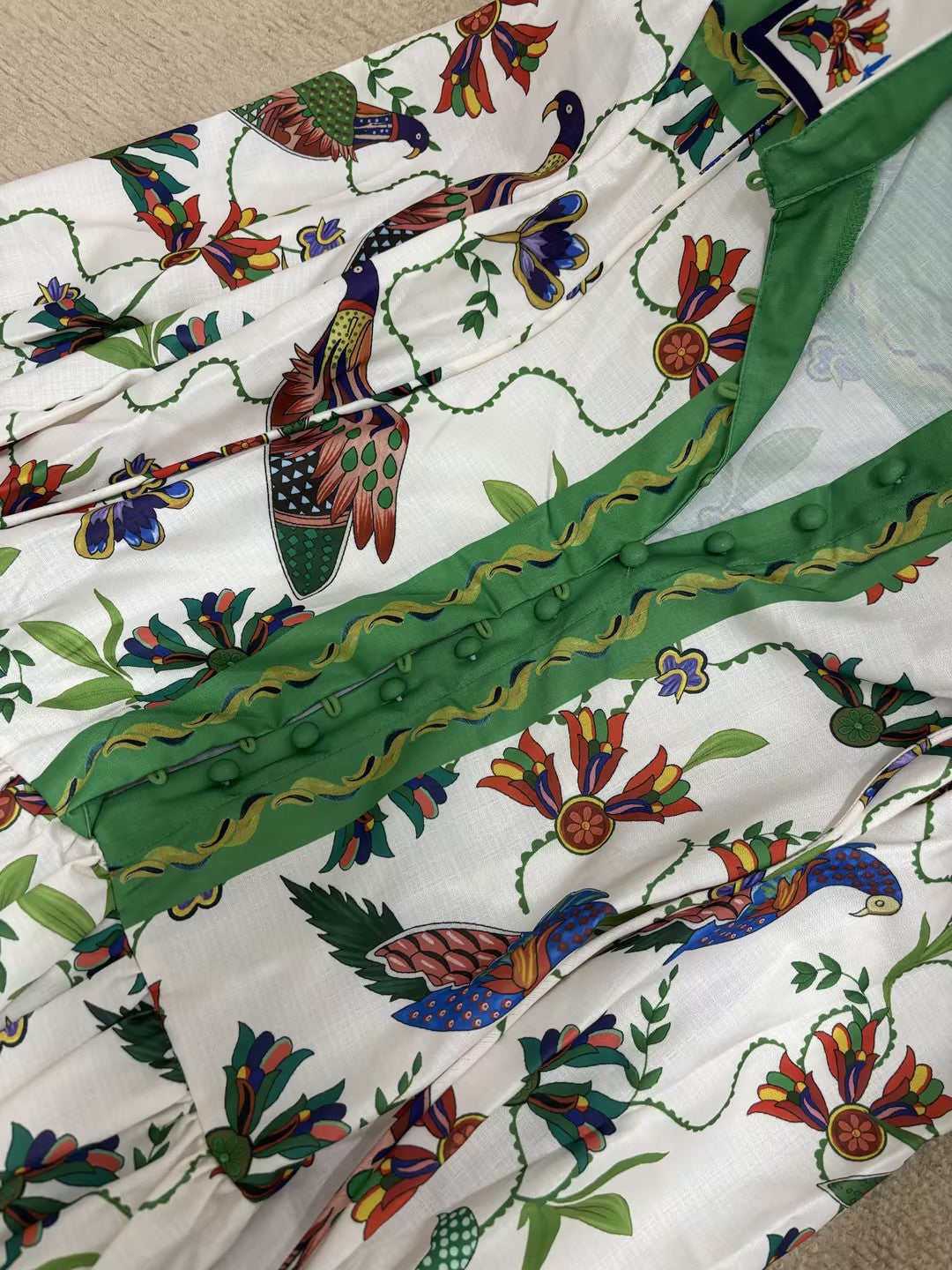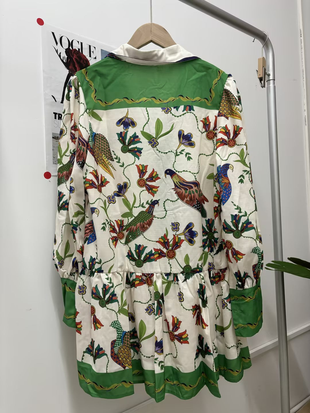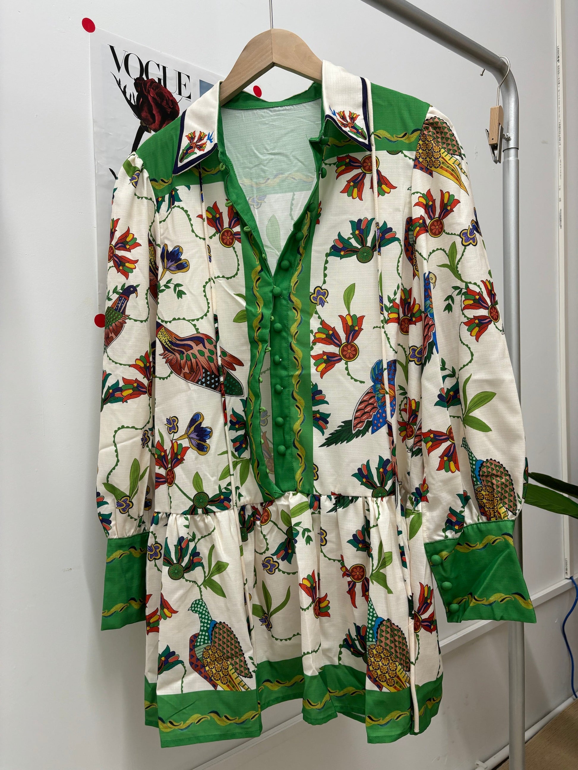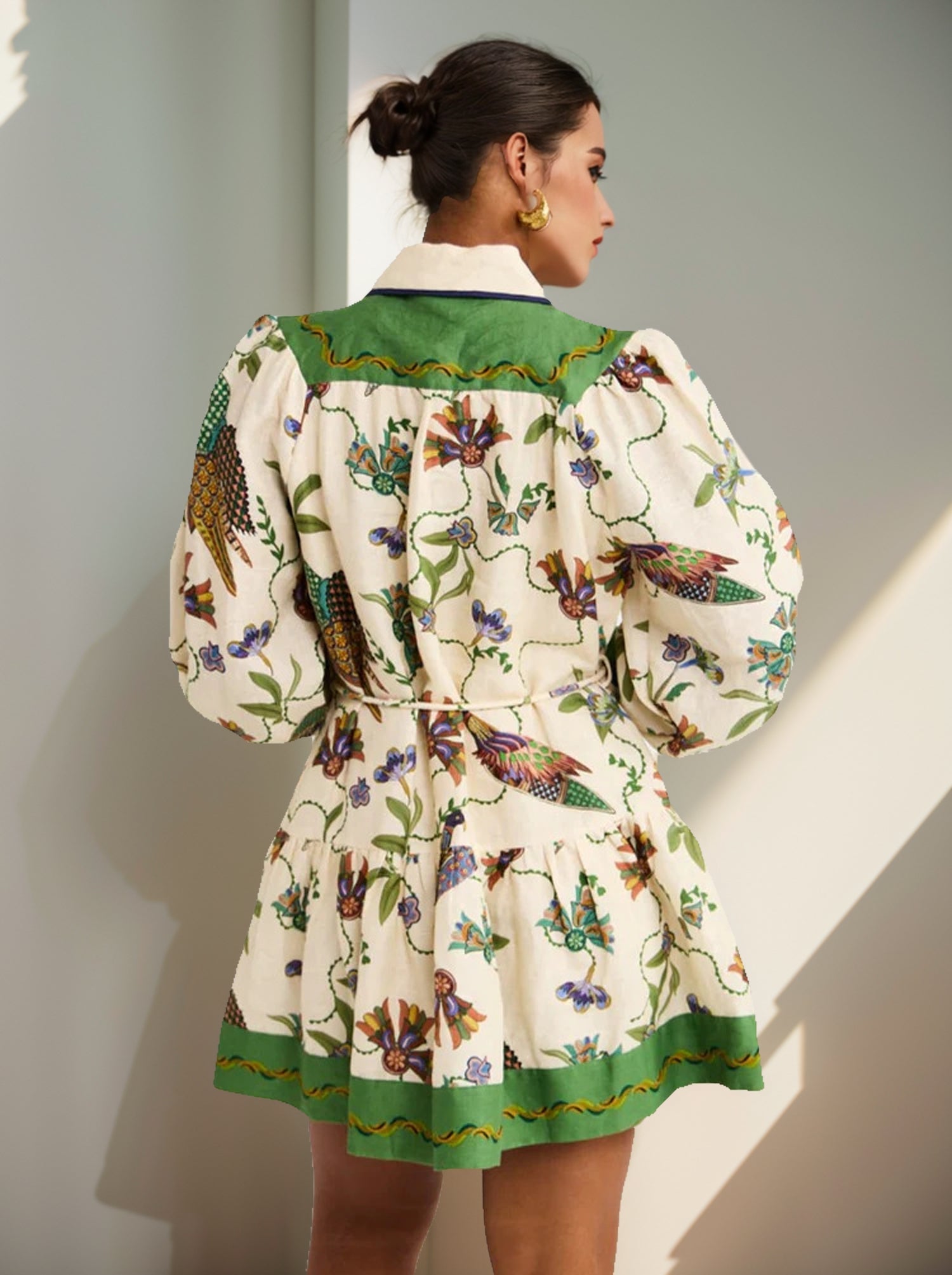 A mini dress featuring an allover floral and paisley pattern, collared neckline, long puff sleeves, drawstring waist, and flared hem.