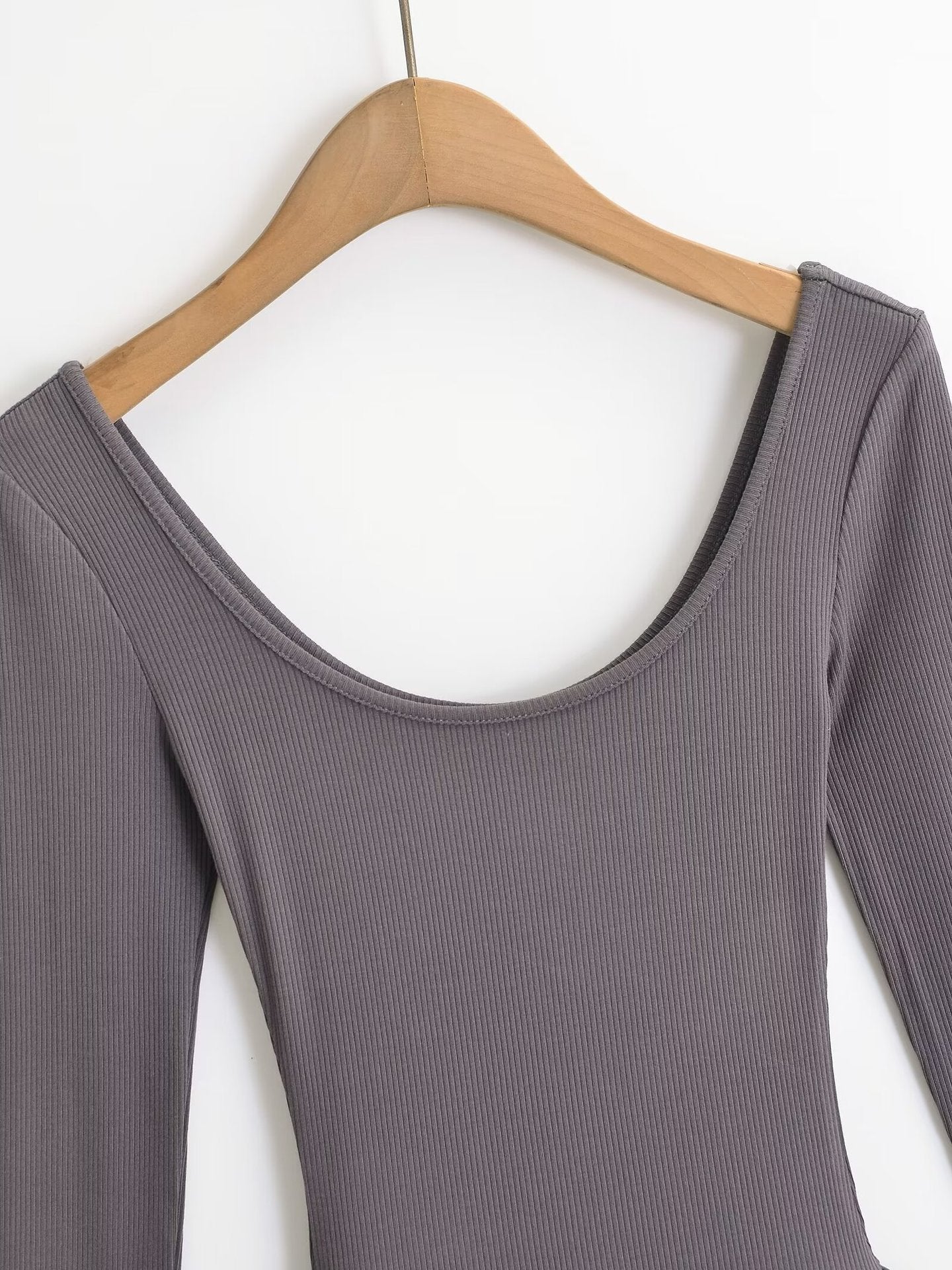 A long sleeve mini dress featuring a scoop neckline, fitted bodice, and flared skirt.