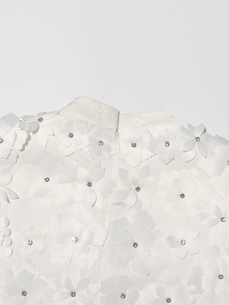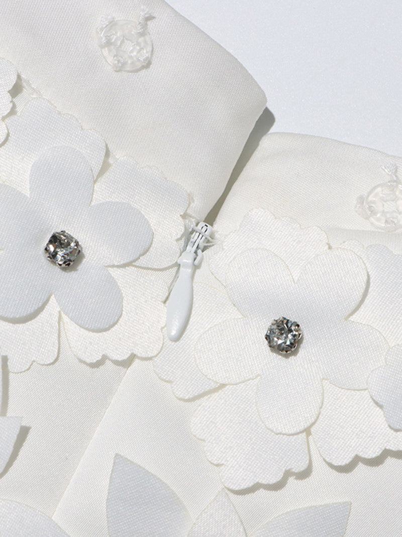 A sleeveless A-line dress featuring a high neck and 3D floral appliqué detailing from the chest to the hem.