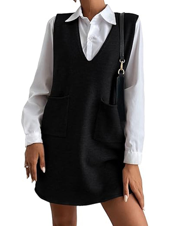 A sleeveless mini dress with a V-neckline and front pockets, offering a relaxed fit.